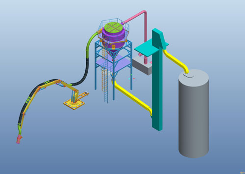本系統采用羅茨真空泵作為抽吸的動力,通過液壓吸臂和吸頭將水泥從散裝貨倉中吸至分離器,然后采用自然沉降、旋風分離、布袋過濾等一系列工藝,將水泥與空氣分離,分離后的水泥經過三通閥,進入到倉泵①中,倉泵①料滿后料位儀報警,三通閥切換方向,水泥開始進入到倉泵②中,與此同時倉泵①的加壓閥、流化閥和出料閥打開,開始加壓送料,水泥通過管道和庫頂閥門的切換被輸送至一個或多個料倉中,倉泵①料送空后,倉泵②料滿,三通閥切換,倉泵①又開始進料,倉泵②開始送料,如此2個倉泵之間輪換進行吸料和送料,與物料分離后的清潔的空氣從分離器上部經過排風管,進入羅茨真空泵,然后從羅茨真空泵出風口排至大氣。