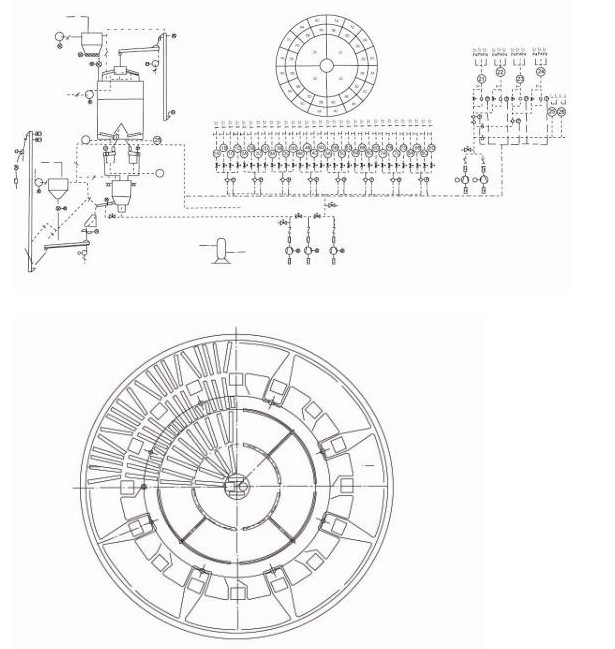 CP生料均化庫為一種新型生料均化庫,具有電耗低、均化效果好等特點。CP生料均化庫是庫頂生料通過8條斜槽均勻布料,不同時期的生料在庫內(nèi)呈橫向分布,庫底充氣系統(tǒng)設(shè)計更符合生料充氣后的流動性,呈放射狀斜向分布,環(huán)形區(qū)一般分8個區(qū),每隔5分鐘輪流充氣,充氣區(qū)生料因松動及氣流的引導(dǎo)卸入中心區(qū),庫內(nèi)不同層的生料豎向切割下料實現(xiàn)生料 的均化,不同時間的生料進(jìn)入中心區(qū)后再進(jìn)行氣體強烈混合均化,從而達(dá)到理想的均化效果。